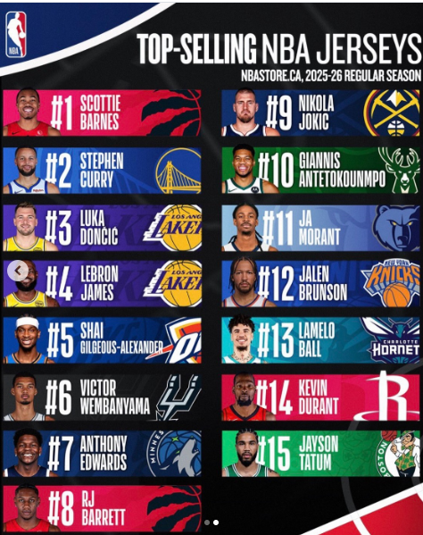 The National Basketball Association revealed sales data from the Canadian NBA Store, and for a fourth year running, franchise star Scottie Barnes has topped the list of the bestselling jerseys for the 2025/2026 regular season.