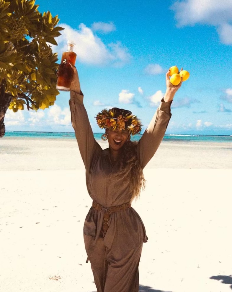 Beyoncé shared images of herself at an unidentified beach, holding her whisky brand Sir Davis and three lemons, which fans speculate may symbolize an upcoming album release, alongside a heartfelt caption thanking fans for their support.