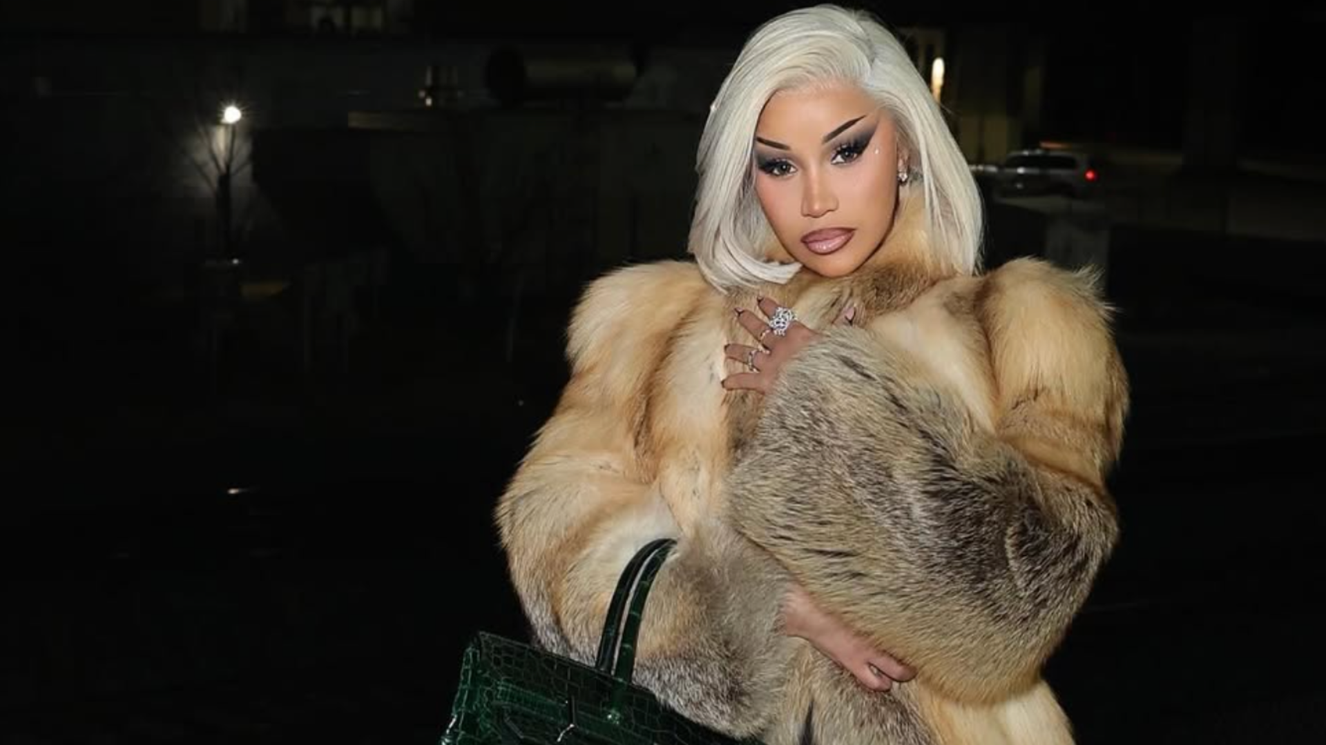 Cardi paired the handbag with a luxurious fur coat and sleek styling, creating a striking visual statement that highlighted the bag as the centerpiece of her ensemble.