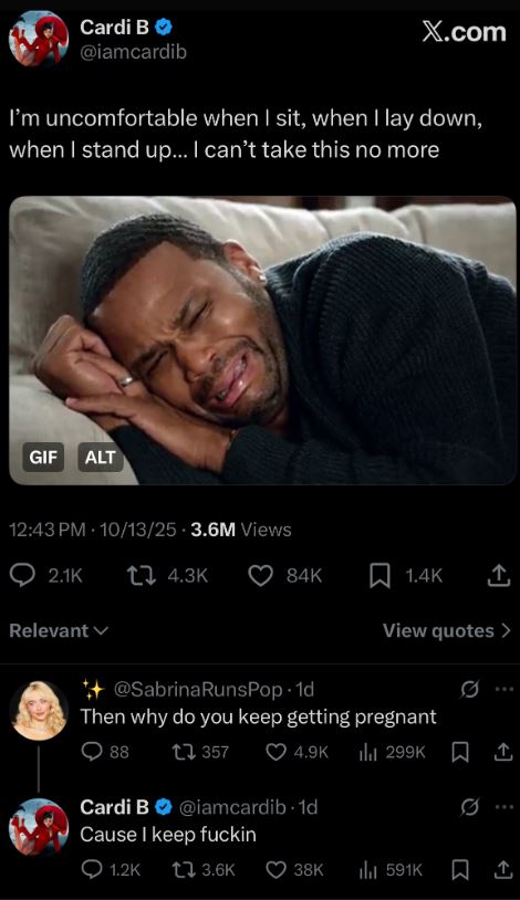 In response to Cardi’s post, one fan asked a question that many others want the answer to: “Then why do you keep getting pregnant?” With unfiltered honesty, the soon-to-be mother-of-four candidly replied, “Cause I keep f**king.”