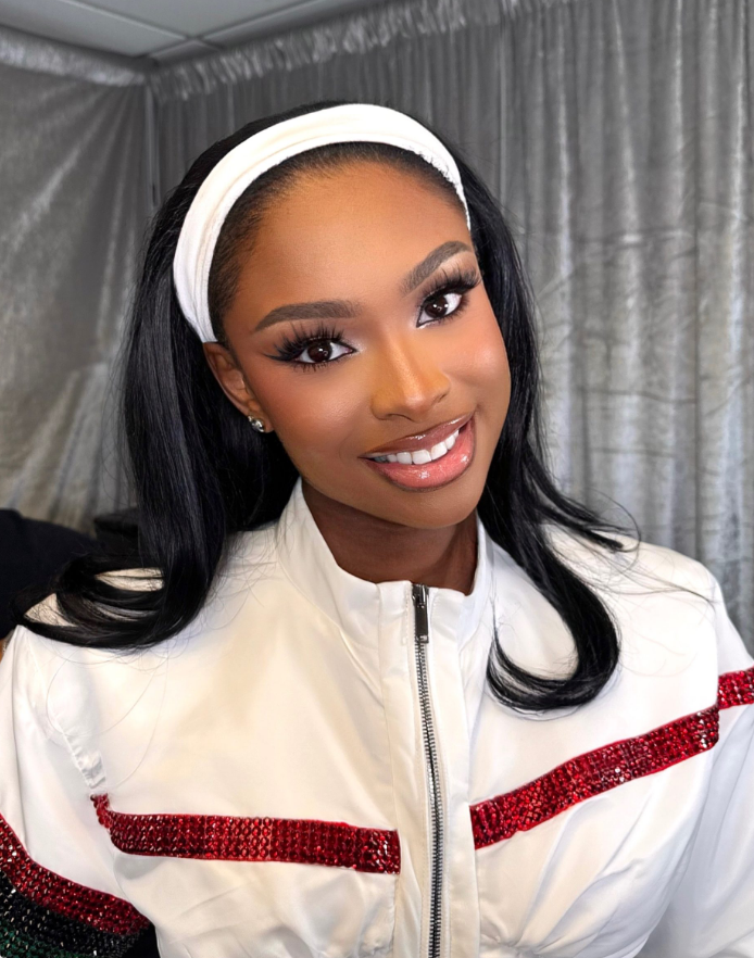 The makeup focused on enhancing Jones’ deep complexion with a flawless skin finish, using Benefit Cosmetics Matte Primer and foundation, along with bronzer for warmth.