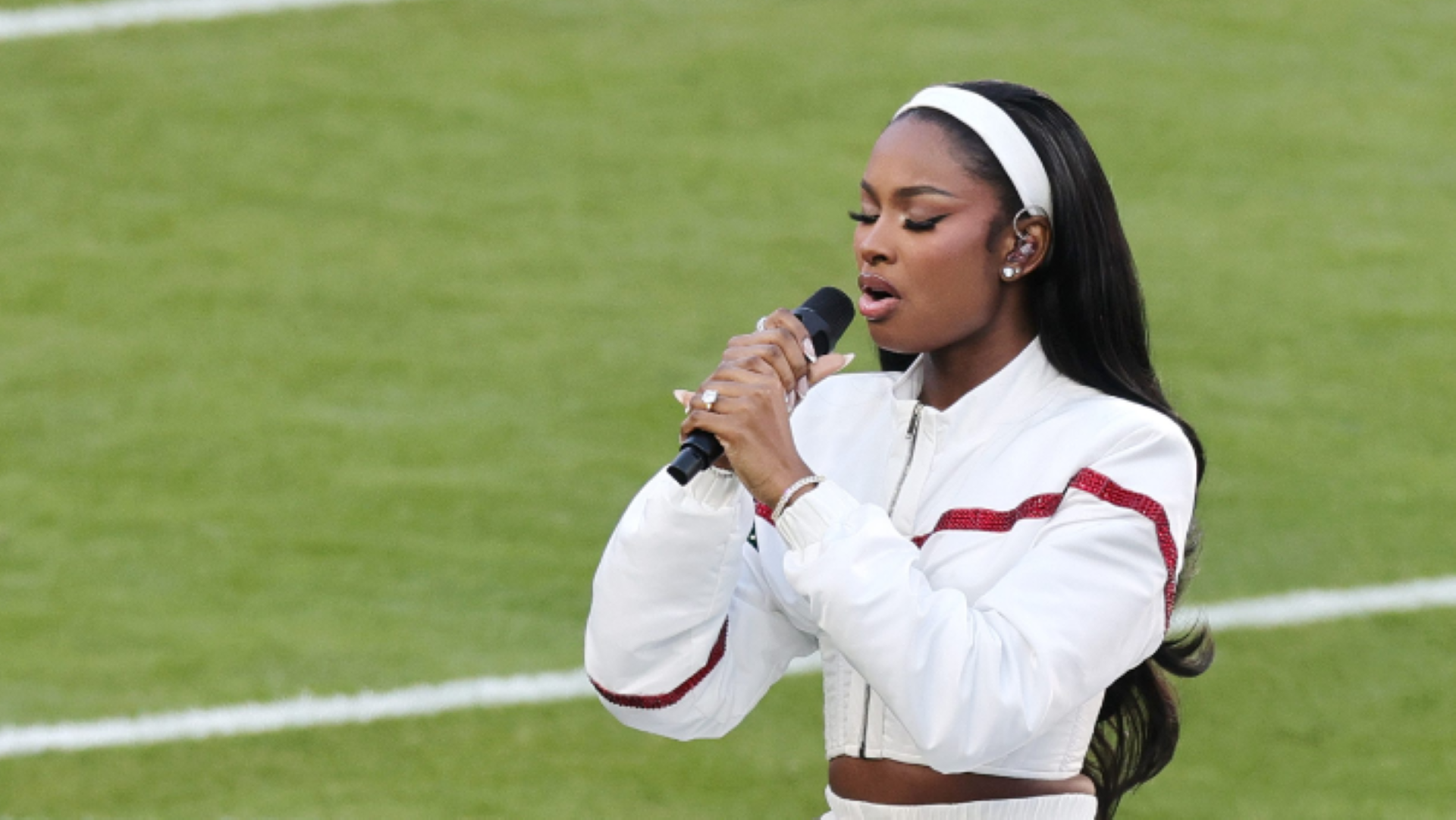 The overall aesthetic was completed with sporty black hair pulled back by a white headband and classic French tip nails, channeling Whitney Houston’s iconic 1991 Super Bowl look.