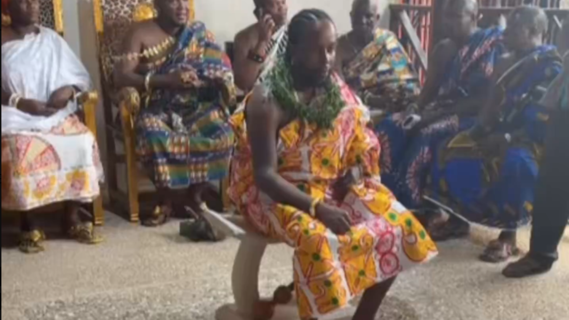 Videos from the ceremony captured the musician dressed in a kente cloth, with herbs tied around his neck, as chiefs performed the traditional enstoolment ritual, placing him on the stool three times to signify his acceptance.