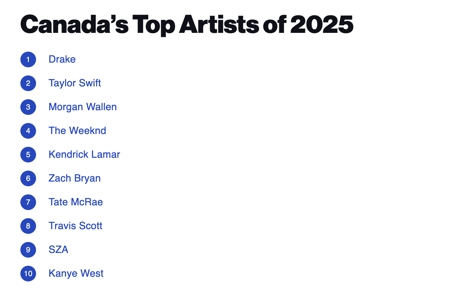 Spotify just dropped the crown jewels of Canada’s streams for 2025. No shocker—Drake is still on top…But he’s sharing the spotlight with The Weeknd, Kendrick, SZA and more.