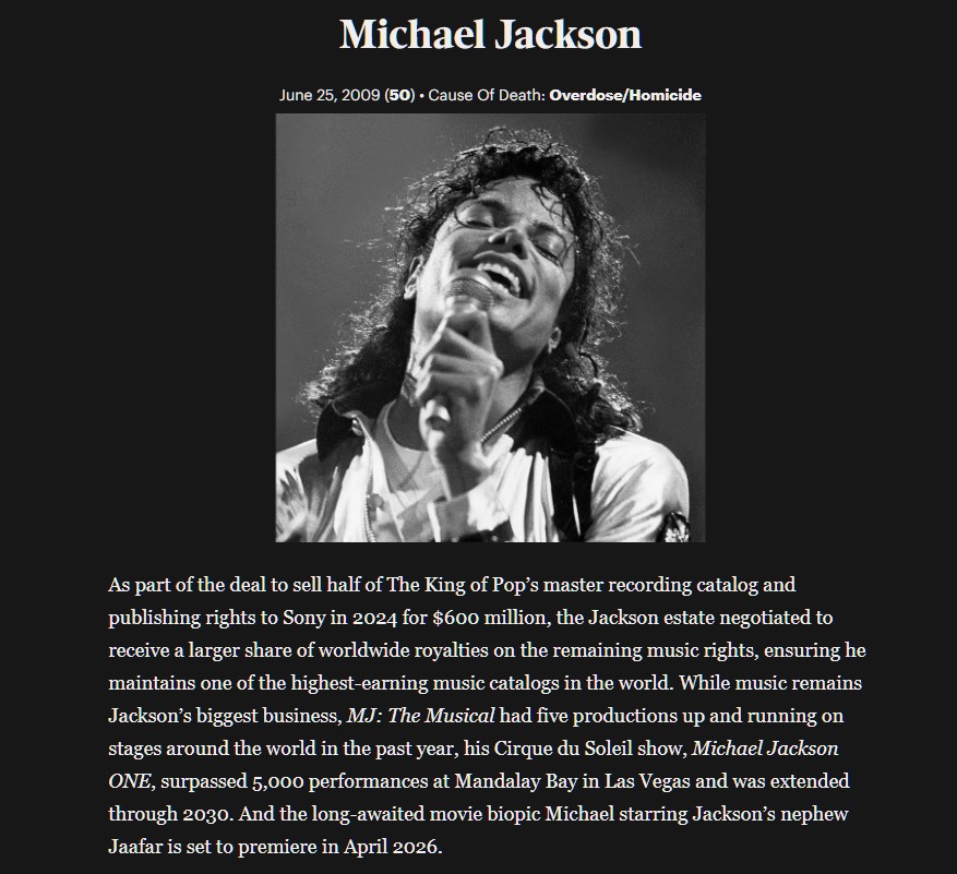 Forbes has released its list of the top paid dead celebrities for 2025.