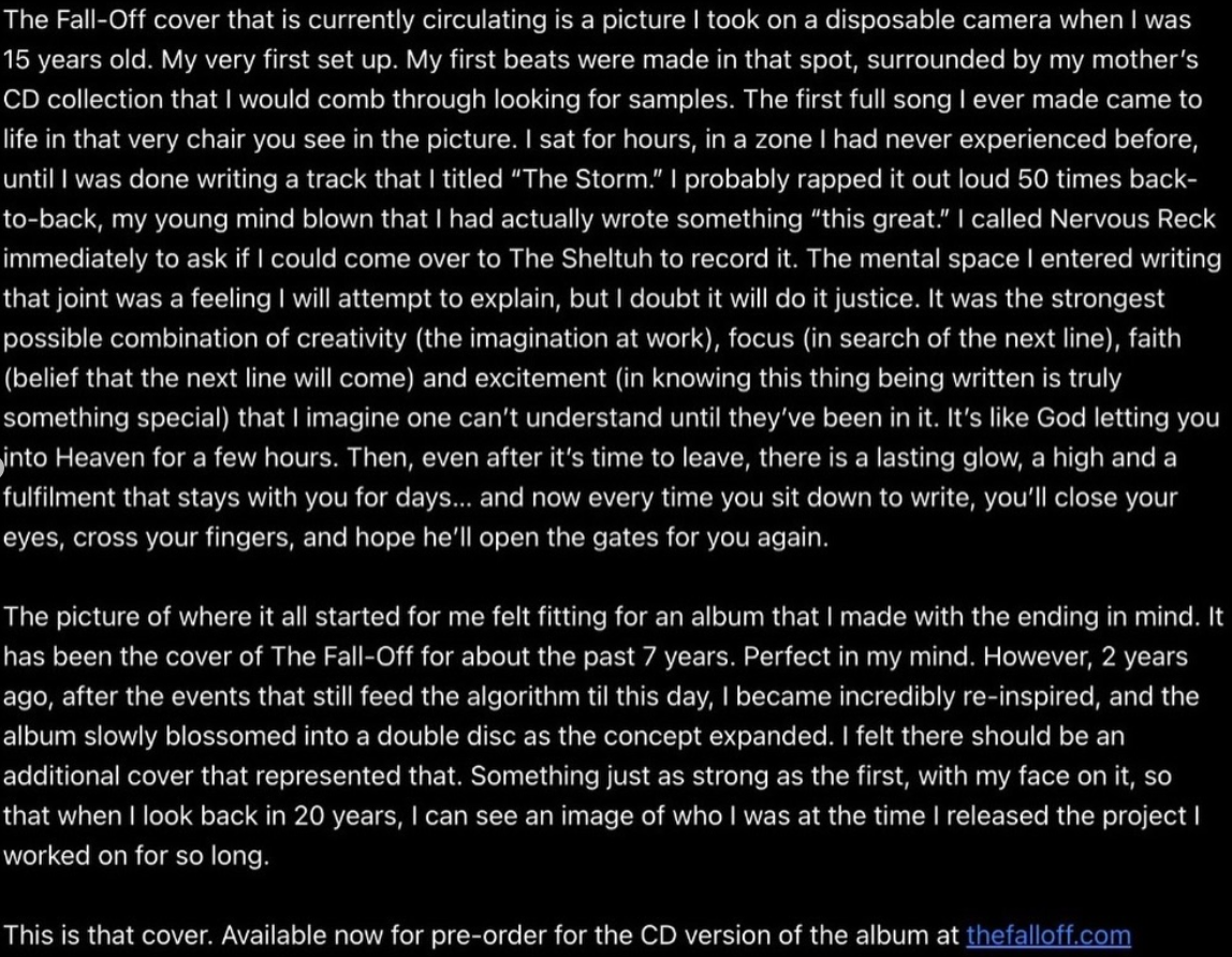 The rapper confirmed he created the project with the intention of it being his final album, sharing, “The Fall-Off brings the concept of my first project full circle… older and a little closer to peace.”