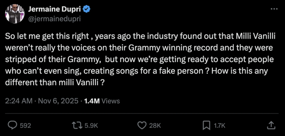 Which raises the obvious question — reach out how, and to who exactly? It’s a surreal moment when an artist finds themselves beefing with someone who isn’t even real, highlighting just how strange the future of music is becoming.