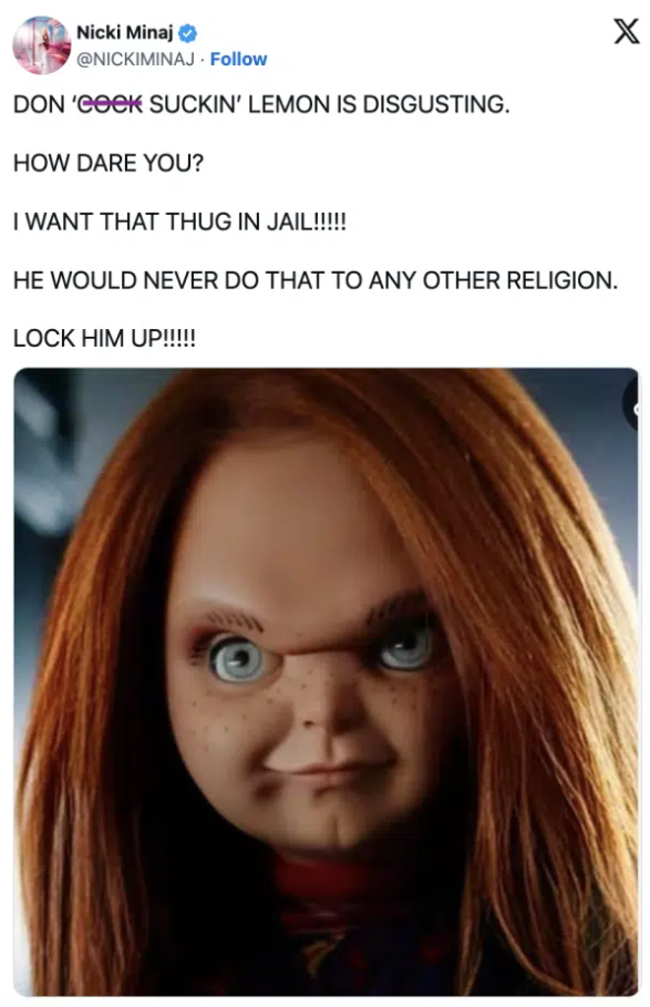 In a fiery response, Minaj shared a picture of the horror character Chucky and called Lemon “disgusting.”, She explicitly said, “I want that thug in jail,” referring to Lemon, and added, “Lock him up!”, Minaj also accused Lemon of religious bias, claiming he would “never do that to any other religion.”