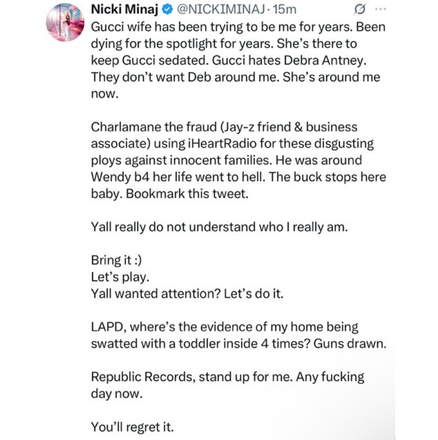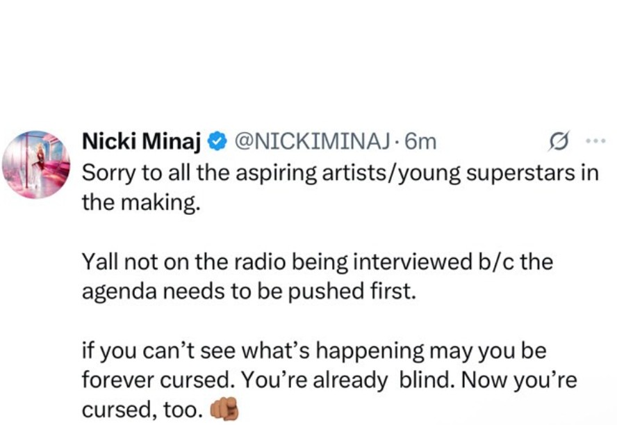 Minaj did not take a complete social media break. She was posting content on X all day Tuesday.