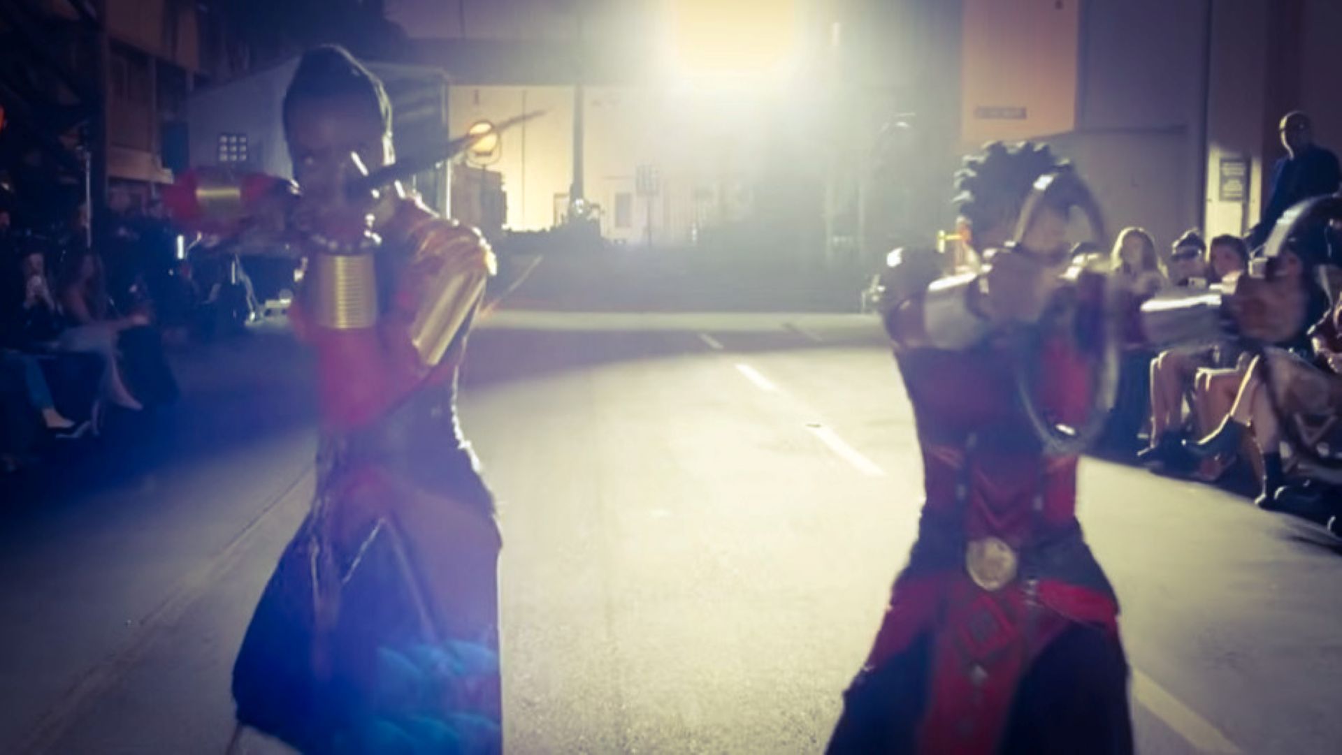Teyana Taylor and Danai Gurira walk the Paramount Pictures lot runway in costumes Ruth E. Carter designed for 2018’s Black Panther.