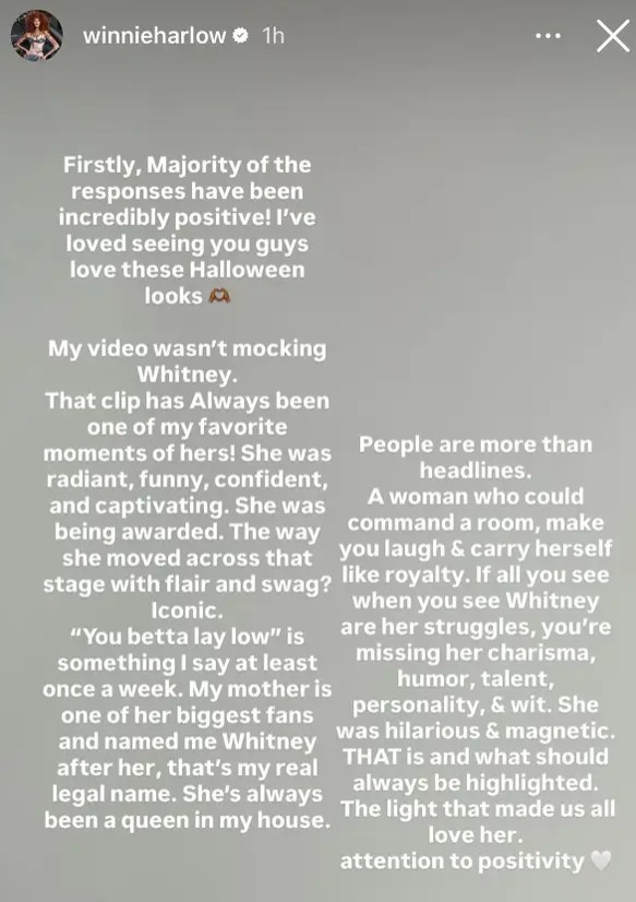 Winnie addressed the backlash on her Instagram story, saying that she meant to celebrate Whitney, not mock her. “That clip has always been one of my favorites,” she said. “She was radiant, funny, confident, and captivating. She was being awarded. The way she moved across that stage with flair and swag? Iconic.”